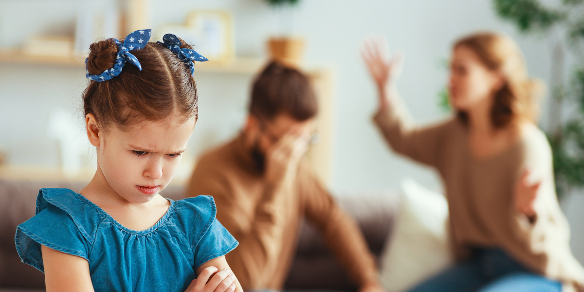 A young girl, looking upset with her arms crossed, stands in the foreground. In the blurred background, two adults appear to be arguing intensely, highlighting the emotional impact of parental conflict on children.